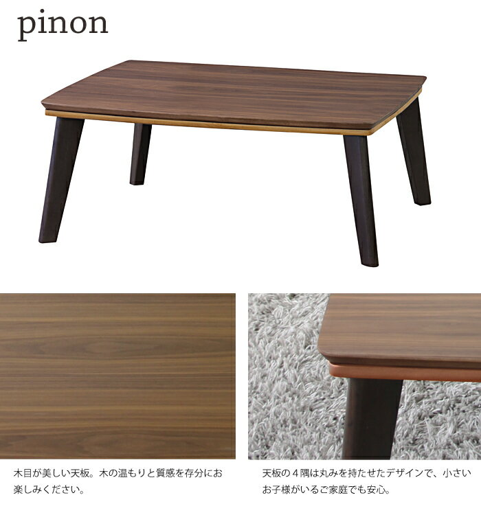 予めご了承くださいませ商品 ピノン こたつテーブル サイズ 幅900×奥行600×高さ370mm 素材 天然木(ラバーウッド)ウレタン塗装・天然木化粧繊維版(ウォルナット)・メラミン化粧繊維版 ヒーター:石英管ヒーター300w カラー - 生産 - 組立品 備考 シンプルで可愛らしい北欧風のデザインのこたつテーブルで、天板のウォール ナットの木目が美しいピノン。